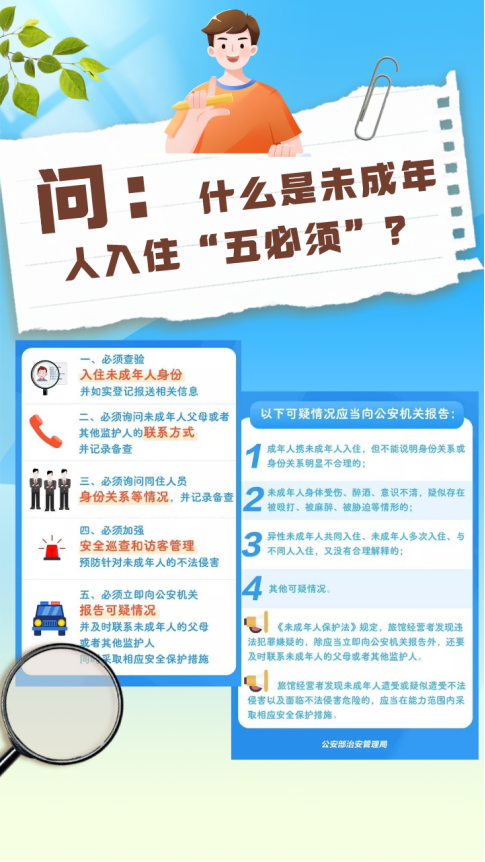 根據(jù)《未成年人保護法》《治安管理處罰法》《旅館業(yè)治安管理辦法》等法律法規(guī),公安部對旅館經(jīng)營者接待未成年人入住提出“五必須”要求,以切實防范在旅館中侵害未成年人案件的發(fā)生,保護未成年人身心健康。