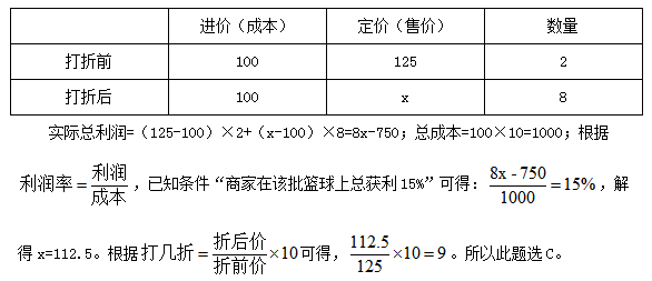 例1:某商店購進一批籃球,定價為進價的125%,在售出進貨量的20%后,商店決定打折促銷?;@球全部賣完后,商家在該批籃球上總獲利15%,問該商店這次促銷價為定價的多少折?( )