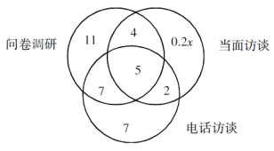 方法二,分析題意,可知總?cè)藬?shù)相當于參與問卷調(diào)研和電話訪談的實際人數(shù),再加上只參與當面訪談的人數(shù)。設總?cè)藬?shù)為x,則有27+21-12+0.2x=x,解得x=45。