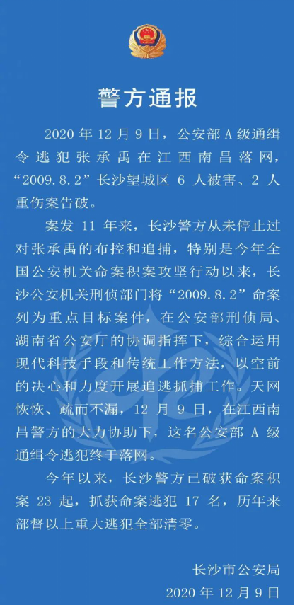 湖南省長沙市公安局日前在其官方微博發(fā)布通報稱,12月9日,公安部A級通緝令逃犯張承禹在江西南昌落網(wǎng),“2009.8.2”長沙望城區(qū)6人被害、2人重傷案告破。為此公安部A級通緝令在逃人員庫又減少一人。