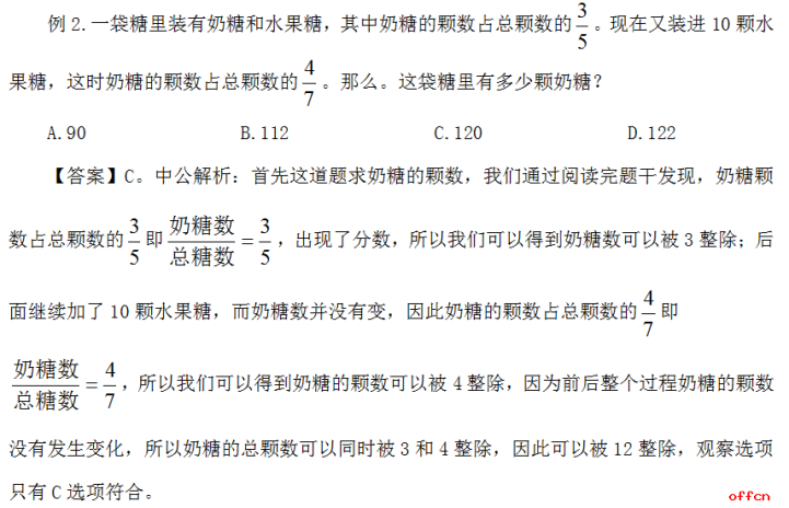 利用整除法去解題,不需要分析題干中的所有條件,不需要層層遞進(jìn)的分析題干中各種數(shù)量之間的關(guān)系,重點(diǎn)在于抓住題干中的一句話,或者一個簡單的符號來分析問題,排除錯誤選項(xiàng),這也是整除法的核心。