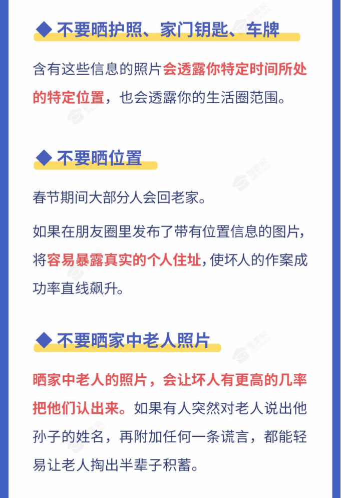 你知道嗎,有些行為可能會(huì)泄露個(gè)人的相關(guān)信息,如果被別有用心的人看到、利用,將造成家中或個(gè)人財(cái)物被盜竊,甚至危害自己和家人人身安全。