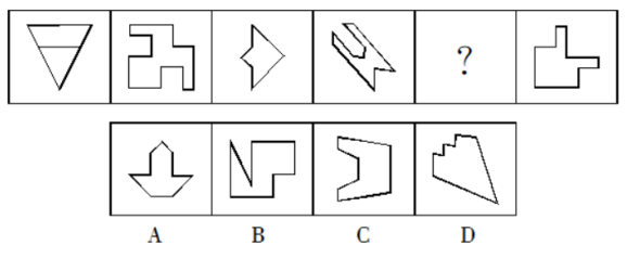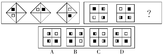 【解析】:觀察題干給出的圖形,發(fā)現(xiàn)圖形相似度不高而且圖形不規(guī)整,優(yōu)先考慮數(shù)量關(guān)系,發(fā)現(xiàn)題干每個圖形都是由三部分構(gòu)成,構(gòu)成圖形的部分數(shù)相同,由此選擇C。