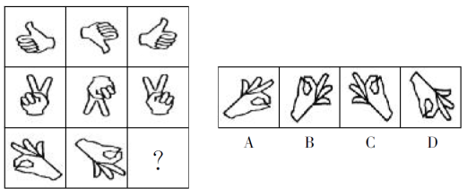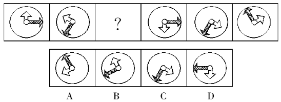 【解析】A。題干圖形的構(gòu)成相同,只是箭頭的位置不同,需要對比分析箭頭位置變化的規(guī)律。從第一個圖形開始,短箭頭每次逆時針旋轉(zhuǎn)60°,長箭頭每次順時針旋轉(zhuǎn)120°,由此可確定問號處圖形箭頭的位置,答案為A。