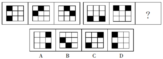 【解析】B。圖形相似度很高,位置不同,考慮位置關(guān)系,題干第一組圖形中的黑色方塊依次順時針移動1格、2格得到下一個圖形;依此規(guī)律,第二組圖形中的黑色方塊依次順時針移動4格、5格得到下一個圖形,整體為遞增規(guī)律,故選B。