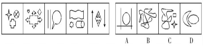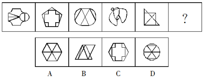 【解析】:觀察題干給出的圖形,題干圖形相似度低,組成較為凌亂,但是每個圖形都被分割成了若干個封閉區(qū)域,優(yōu)先數(shù)封閉區(qū)域的個數(shù),發(fā)現(xiàn)題干圖形的封閉區(qū)域數(shù)都是6,應(yīng)選A。
