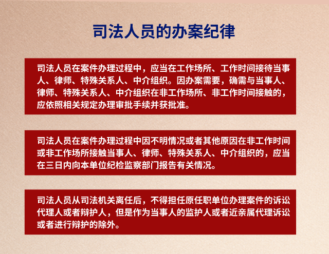 第三條 各級(jí)司法機(jī)關(guān)應(yīng)當(dāng)建立公正、高效、廉潔的辦案機(jī)制,確保司法人員與當(dāng)事人、律師、特殊關(guān)系人、中介組織無(wú)不正當(dāng)接觸、交往行為,切實(shí)防止利益輸送,保障案件當(dāng)事人的合法利益,維護(hù)國(guó)家法律統(tǒng)一正確實(shí)施,維護(hù)社會(huì)公平正義。