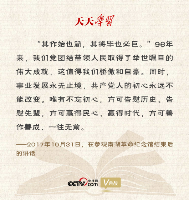 此行中,習(xí)近平總書記引用了“其作始也簡,其將畢也必巨”這句古語。他站在歷史和時(shí)代的高度,回顧中國共產(chǎn)黨從小到大、從弱到強(qiáng)的光輝歷程,解讀黨的初心,強(qiáng)調(diào)學(xué)習(xí)革命先輩的崇高精神,并號召全黨同志不忘初心、牢記使命、永遠(yuǎn)奮斗。習(xí)近平總書記的講話激勵全黨全軍全國人民進(jìn)一步增強(qiáng)責(zé)任感和使命感,以永不懈怠的精神狀態(tài)和一往無前的奮斗姿態(tài),繼續(xù)朝著實(shí)現(xiàn)中華民族偉大復(fù)興的宏偉目標(biāo)前進(jìn)。