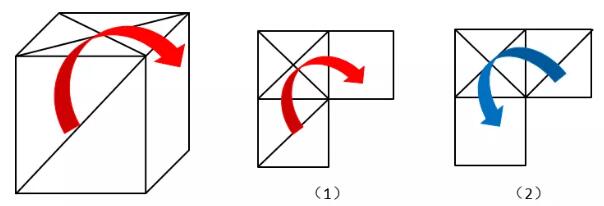 所謂時(shí)針?lè)?,就是利用各個(gè)面展開(kāi)、折疊后相對(duì)位置不發(fā)生變化的特性,在三個(gè)相鄰面上畫(huà)時(shí)針。畫(huà)時(shí)針的時(shí)候要注意確定好起點(diǎn)面、路徑面和終點(diǎn)面,當(dāng)題干與選項(xiàng)的時(shí)針?lè)较虿灰恢聲r(shí),即為錯(cuò)誤選項(xiàng)。例如圖4,原圖中以斜線面為起點(diǎn)、X面為路徑、空白面為終點(diǎn),所畫(huà)時(shí)針為順時(shí)針,而以同樣的方式畫(huà)時(shí)針,(1)為順時(shí)針、(2)為逆時(shí)針,則(2)一定為錯(cuò)誤選項(xiàng)。