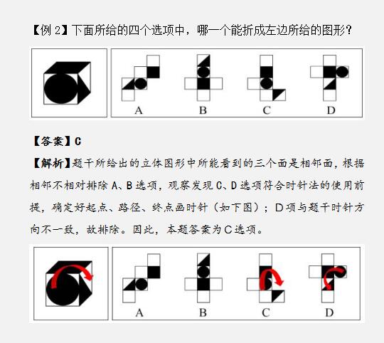 這里需要注意的是時(shí)針?lè)ㄖ荒芘懦e(cuò)誤選項(xiàng),不能鎖定正確選項(xiàng)。因?yàn)闀r(shí)針?lè)ㄖ豢紤]面與面之間的相對(duì)位置,沒(méi)有考慮各面中圖案的細(xì)節(jié)。