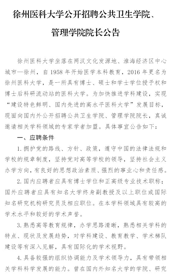 徐州醫(yī)科大學(xué)公開招聘公共衛(wèi)生學(xué)院、管理學(xué)院院長公告