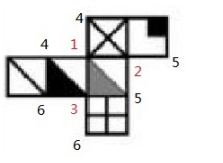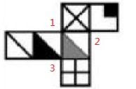 此時我們看到,題目每個選項都是要兩個三角形和×這三個面相連的關系,根據(jù)剛剛標的點,是1連接了這三個面,所以應該在黑三角圖中位置方向的右上角,灰色三角圖中位置的左上角,×面的任意位置,根據(jù)這三個位置鎖定答案D。