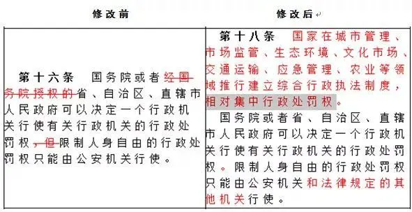 ?明確了相對(duì)集中行使行政處罰權(quán)的領(lǐng)域,在行政處罰法中確認(rèn)了多年來綜合執(zhí)法制度改革的成果;決定行政機(jī)關(guān)行使行政處罰權(quán)的機(jī)構(gòu)刪除了“經(jīng)國(guó)務(wù)院授權(quán)的”;增加了限制人身自由的行政處罰權(quán)的行使機(jī)關(guān)——法律規(guī)定的其他機(jī)關(guān)。