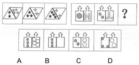 答案:D【解析】:通過分析我們發(fā)現(xiàn),題干所給的第一組圖形,基本都是由1個平行四邊形分成兩半,同時里面分別填充了一些黑色和白色的星星。這時,我們可以嘗試著,將題干中的小圖形,用嘴巴“讀出來”,進而看看能不能找到一些規(guī)律。