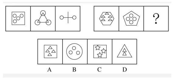 答案:C【解析】:分析題干,我們發(fā)現(xiàn)所給出的圖形是由多個小圖形組成的,這時我們可以優(yōu)先考慮“元素種類”和“元素個數(shù)”的規(guī)律。