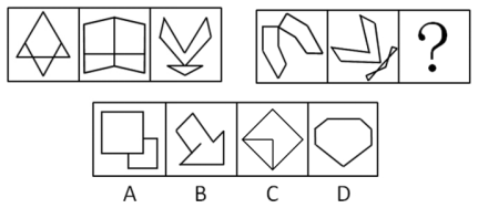 這時我們來看一下第二組的圖形:在第二組中,圖1、2、3外部直線數(shù)為6、5、?,問號處圖形外部輪廓直線數(shù)應(yīng)為4,排除B、D項。繼續(xù)觀察,第二組中同種元素的個數(shù)分別為5、4、?問號處圖形同種元素個數(shù)應(yīng)該為3,只有C項符合。故正確答案為C。