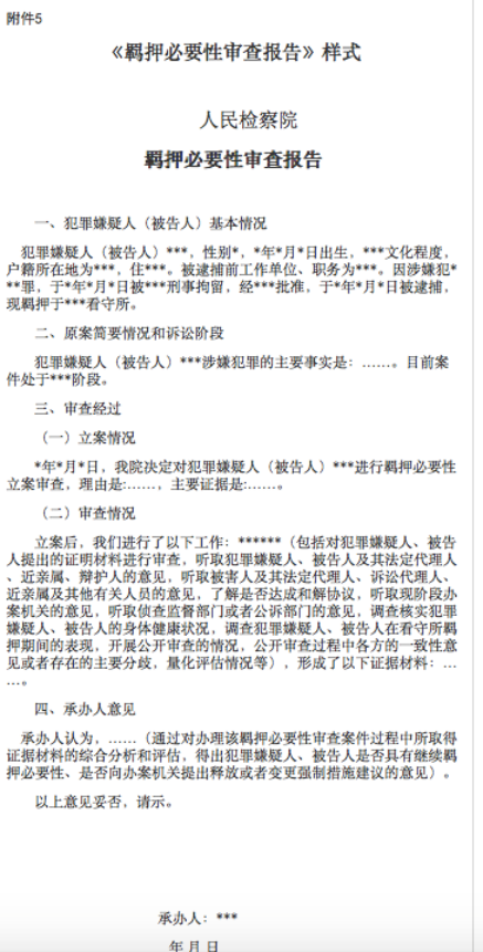 (3)最高人民檢察院《人民檢察院辦理羈押必要性審查案件規(guī)定(試行)》2016年1月13日最高人民檢察院頒布了《人民檢察院辦理羈押必要性審查案件規(guī)定(試行)》,為了加強和規(guī)范羈押必要性審查工作,維護被逮捕的犯罪嫌疑人、被告人合法權利具有重要作用。努力發(fā)揮非羈押措施的替代作用,擴大使用非羈押措施,保障人權。(4)最高人民檢察院刑事執(zhí)行檢察廳《關于貫徹執(zhí)行<人民檢察院辦理羈押必要性審查案件規(guī)定(試行)>的指導意見》該指導意見根據(jù)《人民檢察院辦理羈押必要性審查案件規(guī)定(試行)》指定。該指導意見進一步細化了審查標準、審查內容,增加了評估犯罪嫌疑人、被告人有無繼續(xù)羈押必要性可以采取量化方式,設置加分項目、減分項目、否決項目等具體標準。