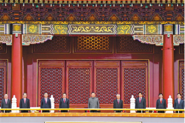 上午7時(shí)53分,在歡快的樂曲聲中,習(xí)近平等黨和國(guó)家領(lǐng)導(dǎo)人來(lái)到天安門城樓主席臺(tái),全場(chǎng)爆發(fā)出熱烈掌聲。