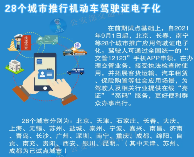 北京等28個(gè)城市推行機(jī)動(dòng)車駕駛證電子化。在前期試點(diǎn)基礎(chǔ)上,北京、長(zhǎng)春、南寧等28個(gè)城市推廣應(yīng)用機(jī)動(dòng)車駕駛證電子化。通過(guò)全國(guó)統(tǒng)一的“交管12123”APP發(fā)放電子駕駛證,電子駕駛證在全國(guó)范圍內(nèi)有效,辦理交管業(yè)務(wù)、接受執(zhí)法檢查時(shí)出示使用,并拓展客貨運(yùn)輸、汽車租賃、保險(xiǎn)購(gòu)置等社會(huì)應(yīng)用場(chǎng)景,為駕駛?cè)颂峁┰诰€“亮證”“亮碼”服務(wù),進(jìn)一步簡(jiǎn)化辦事手續(xù)資料,提升證件使用便捷度,更好便利群眾辦事出行。此后,將陸續(xù)在全國(guó)范圍內(nèi)分階段實(shí)施。