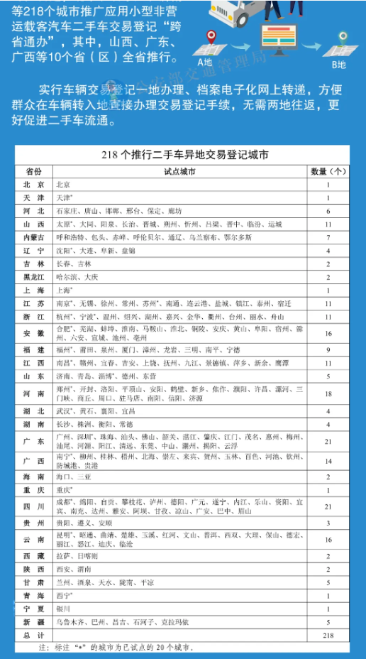 石家莊等218個(gè)城市推行二手車異地交易登記。經(jīng)商商務(wù)部、國(guó)家稅務(wù)總局,在天津、太原、沈陽(yáng)、上海等20個(gè)城市試點(diǎn)推行小型非營(yíng)運(yùn)載客汽車二手車交易登記“跨省通辦”基礎(chǔ)上,北京、石家莊、濟(jì)南等218個(gè)城市推廣應(yīng)用,其中,山西、廣東、廣西等10個(gè)?。▍^(qū))全省推行。對(duì)二手車需要在異地交易的,實(shí)行二手車交易登記一地辦理、檔案電子化網(wǎng)上轉(zhuǎn)遞,實(shí)現(xiàn)二手車全國(guó)范圍內(nèi)跨省跨市異地交易登記,無(wú)需兩地往返,更好促進(jìn)二手車流通。