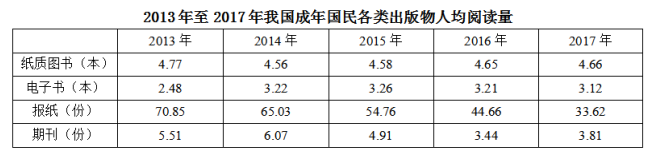 D、2017年我國成年國民人均每天閱讀紙質(zhì)圖書時(shí)長(zhǎng)低于閱讀報(bào)紙與閱讀期刊時(shí)長(zhǎng)之和