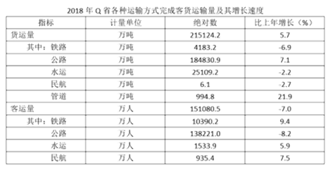 Q省2018年客貨運輸換算周轉(zhuǎn)量5096.9億噸公里,比上年增長4.5%。貨物周轉(zhuǎn)量4143.3億噸公里,增長0.8%。其中,鐵路周轉(zhuǎn)量729.6億噸公里,下降10.0%;公路周轉(zhuǎn)量2731.8億噸公里,增長5.9%。旅客周轉(zhuǎn)量1768.2億人公里,增長12.8%。其中,鐵路周轉(zhuǎn)量865.6億人公里,增長28.0%;公路周轉(zhuǎn)量767.3億人公里,下降1.2%;民航周轉(zhuǎn)量132.3億人公里,增長18.0%。