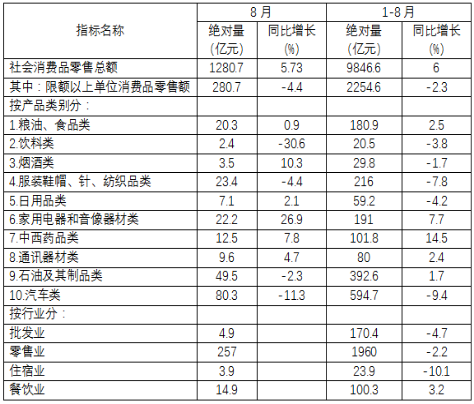 2019年1-8月,遼寧省社會消費品零售總額9846.6億元,比上年同期增長6.0%,增速回落1.6個百分點。限額以上單位消費品零售額實現(xiàn)2254.6億元,同比下降,增速回落6.5個百分點。