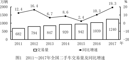 D.2011~2017年,全國二手車交易量同比增速低于10%的年份有4個(gè)