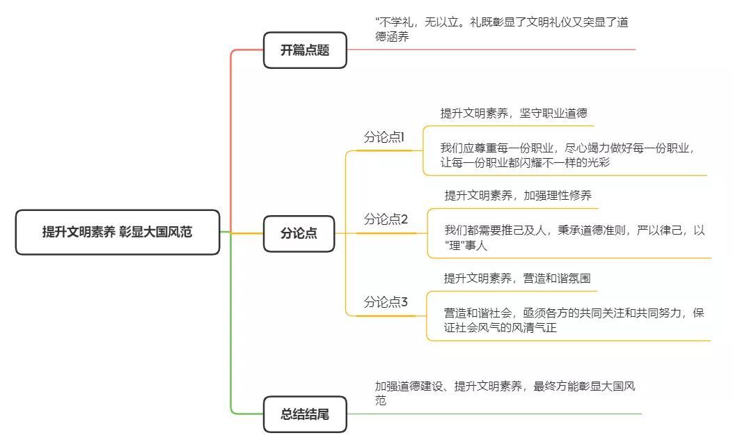 隨著我國(guó)改革開放步伐的加快,我國(guó)的社會(huì)主要矛盾已經(jīng)發(fā)生了改變,但是,人們的精神文明卻與之不相匹配,這無(wú)疑引發(fā)了我們的深思。提升文明素養(yǎng),離不開個(gè)人對(duì)于職業(yè)道德的踐行,離不開個(gè)人對(duì)于理性原則的把握,更離不開每個(gè)人對(duì)于和諧的崇尚。加強(qiáng)道德建設(shè)、提升文明素養(yǎng),最終方能彰顯大國(guó)風(fēng)范?!?/span>結(jié)尾使用小排比句式回扣主題】