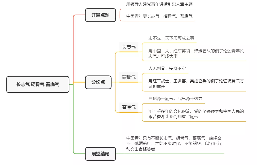 志不立,天下無(wú)可成之事。我們要堅(jiān)定理想信念,做有志氣的新時(shí)代青年。長(zhǎng)志氣,就要不斷筑牢信仰之基、補(bǔ)足精神之鈣、把穩(wěn)思想之舵,以堅(jiān)定的理想信念砥礪對(duì)黨的赤誠(chéng)忠心。中共一大代表平均年齡28歲,長(zhǎng)征途中紅軍將領(lǐng)平均年齡不足25歲,嫦娥團(tuán)隊(duì)、神舟團(tuán)隊(duì)平均年齡33歲,北斗團(tuán)隊(duì)平均年齡35歲……一代代充滿救國(guó)報(bào)國(guó)強(qiáng)國(guó)志氣的優(yōu)秀青年,把青春和熱血融入祖國(guó)江河,展示了磅礴力量。(青年事例,建議積累)新時(shí)代的中國(guó)青年要心懷“國(guó)之大者”,把立大志、明大德、成大才、擔(dān)大任作為人生追求,在感悟真理力量中堅(jiān)定志氣,在學(xué)思踐悟中堅(jiān)定理想信念,在奮發(fā)有為中踐行初心使命。【分論點(diǎn)1:志不立,天下無(wú)可成之事;本段用直接說(shuō)理+事例論證的方式論述長(zhǎng)志氣方可成大事】