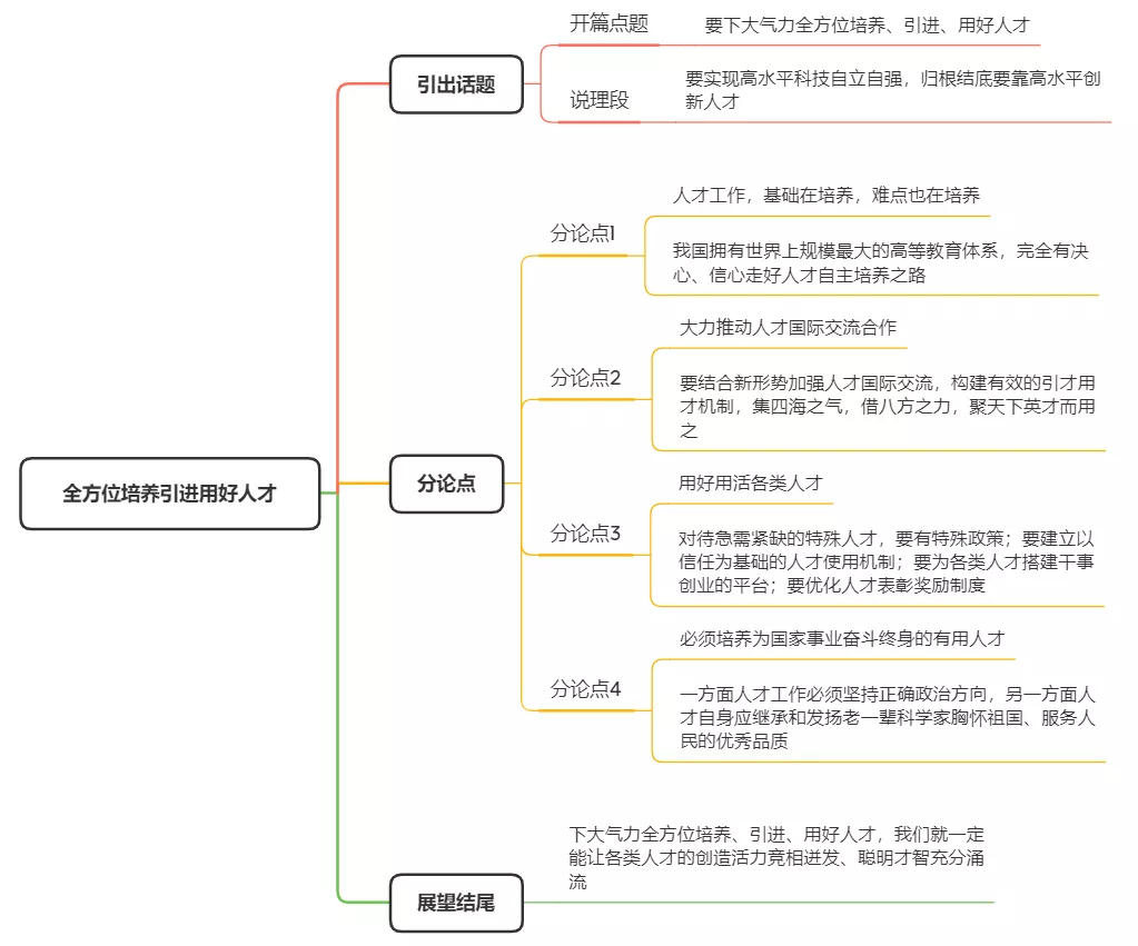 人才工作,基礎(chǔ)在培養(yǎng),難點(diǎn)也在培養(yǎng)。這些年來(lái),黨中央堅(jiān)持高端引領(lǐng)、整體推進(jìn),加快構(gòu)建科學(xué)的人才培養(yǎng)體系,著力培養(yǎng)更多適應(yīng)高質(zhì)量發(fā)展、高水平科技自立自強(qiáng)的各類人才,成果豐碩。應(yīng)當(dāng)看到,培養(yǎng)人才是國(guó)家和民族長(zhǎng)遠(yuǎn)發(fā)展的大計(jì),當(dāng)今世界人才的競(jìng)爭(zhēng)首先是人才培養(yǎng)的競(jìng)爭(zhēng)。我們必須增強(qiáng)憂患意識(shí),更加重視人才自主培養(yǎng),加快建立人才資源競(jìng)爭(zhēng)優(yōu)勢(shì)。要走好人才自主培養(yǎng)之路,高校特別是“雙一流”大學(xué)要發(fā)揮培養(yǎng)基礎(chǔ)研究人才主力軍作用,全方位謀劃基礎(chǔ)學(xué)科人才培養(yǎng),建設(shè)一批基礎(chǔ)學(xué)科培養(yǎng)基地,培養(yǎng)高水平復(fù)合型人才;要制定實(shí)施基礎(chǔ)研究人才專項(xiàng),長(zhǎng)期穩(wěn)定支持一批在自然科學(xué)領(lǐng)域取得突出成績(jī)且具有明顯創(chuàng)新潛力的青年人才;要培養(yǎng)造就大批哲學(xué)家、社會(huì)科學(xué)家、文學(xué)藝術(shù)家等各方面人才。習(xí)近平總書記深刻指出:“我國(guó)擁有世界上規(guī)模最大的高等教育體系,有各項(xiàng)事業(yè)發(fā)展的廣闊舞臺(tái),完全能夠源源不斷培養(yǎng)造就大批優(yōu)秀人才,完全能夠培養(yǎng)出大師。我們要有這樣的決心、這樣的自信。”【分論點(diǎn)1,人才工作,基礎(chǔ)在培養(yǎng),難點(diǎn)也在培養(yǎng)。這一段結(jié)構(gòu)跟平時(shí)咱們常見的分論點(diǎn)寫法略有不同,用的是中心句+說(shuō)理+對(duì)策+說(shuō)理總結(jié)的結(jié)構(gòu)。我國(guó)擁有世界上規(guī)模最大的高等教育體系,完全有決心、信心走好人才自主培養(yǎng)之路】