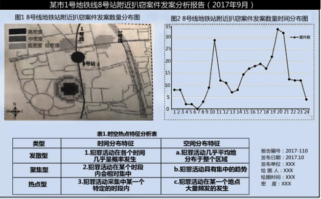(八)某市公安機關針對該市2017年9月份扒竊案件的發(fā)案情況進行了統(tǒng)計分析,下圖為地鐵1號線8號站附近扒竊案件的發(fā)案分析報告。其中,圖1是8號地鐵站附近扒竊案件發(fā)案數(shù)量分布圖(發(fā)案數(shù)量越多,顏色越深),圖2是8號地鐵站附近扒竊案件發(fā)案數(shù)時間分布圖;表1是時空熱點特征分析表。