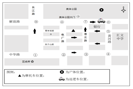 93.某日晚9時許,奧體公園(注 奧體公園只有一個大門進出)發(fā)生一起搶劫殺人案 家住菜市場路1號(圖中※標識的位置)的許女士及其丈夫在奧體公園散步時,遭遇到一個持槍搶劫犯的襲擊,許女士被槍擊身亡(圖中黑圈O標識的尸體位置),其丈夫重傷,他們被搶手機兩部,金項鏈、金耳環(huán)各一條,挎包一個。公安機關立即展開偵査,應査看監(jiān)控錄像的先后順序是(圖片中的順序號即為視頻監(jiān)控)( )(單選)