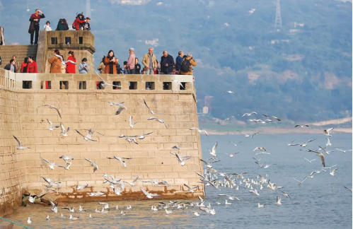 近年來,四川省瀘州市著力打造生態(tài)城市,實施長江生態(tài)環(huán)境綜合治理工程,飛抵瀘州越冬的紅嘴鷗逐年增多。圖為2020年11月13日,市民在瀘州東門口長江邊觀賞紅嘴鷗。新華社發(fā) 牟科/攝