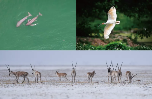 我國系統(tǒng)實施瀕危物種拯救工程,多種瀕危野生動植物得到有效保護和恢復。這是一張拼版照片:左上圖為2021年5月11日,在湖北省宜昌市江邊,長江江豚在水中嬉戲(無人機照片,新華社記者 肖藝九/攝);右上圖為2021年5月13日拍攝的陜西省漢中市洋縣朱鹮生態(tài)園內的朱鹮(新華社記者 劉瀟/攝);下圖為2021年4月20日,藏羚羊在三江源可可西里地區(qū)活動(新華社記者 吳剛/攝)。