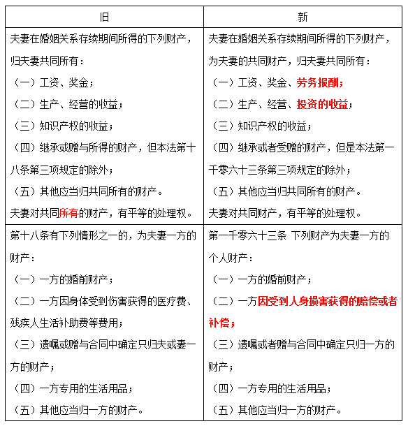 從上述內(nèi)容中不難看出民法典對(duì)于婚姻中夫妻財(cái)產(chǎn)部分改動(dòng)還是比較大的。主要是在共同財(cái)產(chǎn)中增加了勞務(wù)報(bào)酬以及投資的收益以及擴(kuò)大了一人身體傷害獲得賠償、補(bǔ)償金的范圍。其中最主要的就是共同財(cái)產(chǎn)中的: