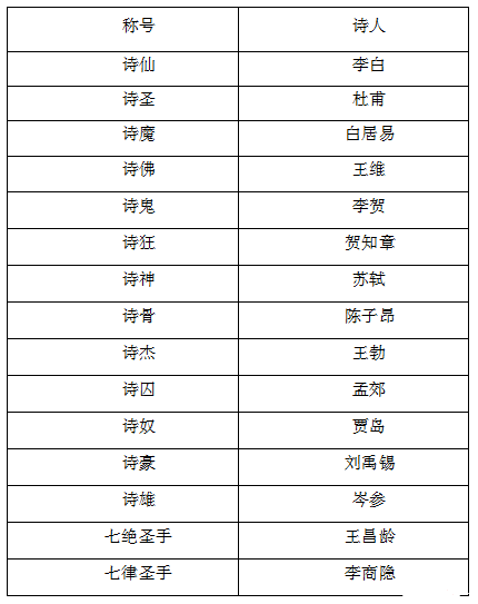 根據(jù)唐詩(shī)中詩(shī)人寫(xiě)作內(nèi)容的不同風(fēng)格,后人賦以不同的稱(chēng)號(hào),為了方便大家識(shí)記,咱們以表格的形式進(jìn)行梳理:
