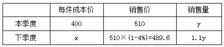 【答案】B【解析】設(shè)下季度每件成本價(jià)為x元,本季度銷售y件,梳理題干可列表如下: