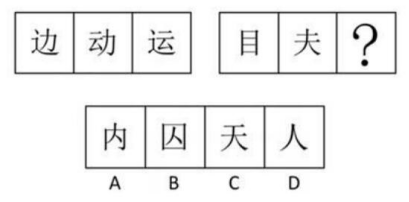 【答案】D【解析】考察漢字的筆畫數。第一組漢字的筆畫數依次為3、3、6,第三個字的筆畫數為前兩個漢字之和。同樣的規(guī)律,第二組的第三個漢字應該為5+8=13,故正確答案為D。