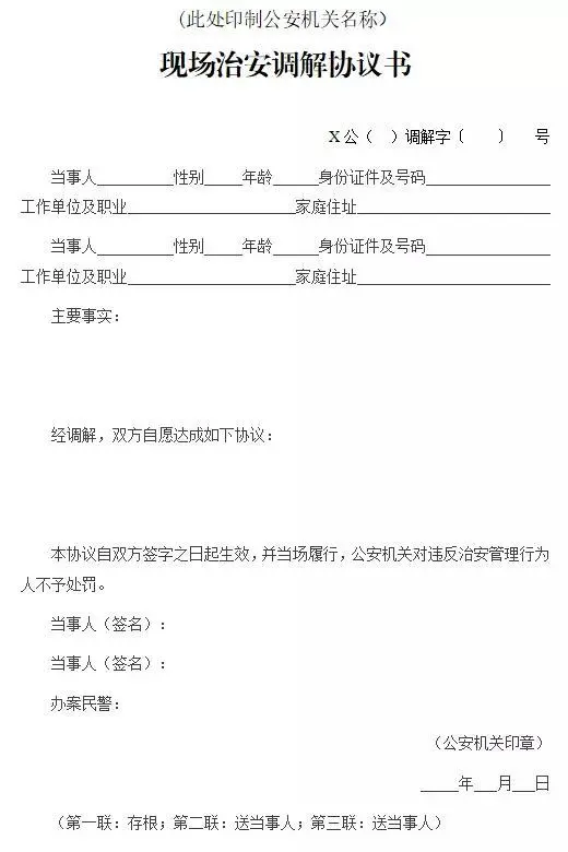 現(xiàn)場調(diào)解達成協(xié)議的,應(yīng)當制作《現(xiàn)場治安調(diào)解協(xié)議書》一式三聯(lián)(式樣附后),由雙方當事人簽名。