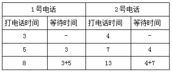 【例題2】公用電話亭中有兩部電話,六個人排隊打電話,打完即走,他們的通話時間分別為3分鐘、5分鐘、4分鐘、13分鐘、7分鐘、8分鐘,則大家在此公用電話亭逗留的總時間最少為( )分鐘。