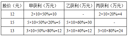 【例題1】甲、乙、丙三人各出100萬元資金購買某種每股10元的股票,當股價漲到12元時甲賣出50%,丙賣出20%;當股價漲到15元時甲賣出剩余部分的20%,乙賣出60%;此后股價回落到13元時三人全部賣出剩余股票。如不計稅費,則此次投資獲利最高的人比獲利最低的人多賺多少萬元?( )