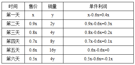 對于本題,想要求總利潤與總成本之間的關(guān)系,就得理清楚這六天的利潤和成本的情況,由于涉及的天數(shù)較多,為避免混亂,表格法整理必是首選。另外,需要注意的是,審題要仔細,售價是每天都下降原價的10%,而銷量是比上一天多1倍。