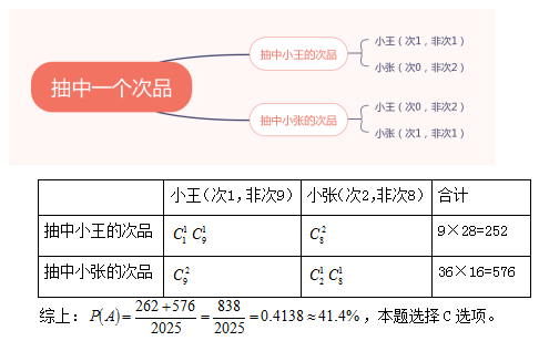 【例題】小王和小張各加工了10個零件,分別有1個和2個次品。若從兩人加工的零件里各隨機選取2個,則選出的4個零件中正好有1個次品的概率為:( )