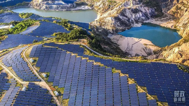 2021年3月,廣東梅州,東石鎮(zhèn)在荒蕪的礦區(qū)建成光伏發(fā)電站,山體重披綠裝。