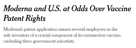 今年11月,《紐約時報》刊文《莫德納和美國在疫苗專利權(quán)問題上發(fā)生分歧》(Moderna and U.S. at Odds Over Vaccine Patent Rights),披露了莫德納和美國官方的專利權(quán)之爭。