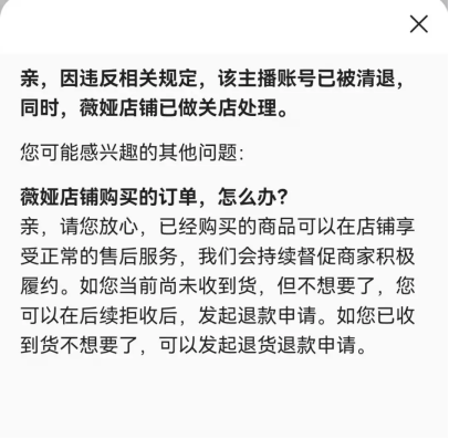 此前,有記者曾詢問薇婭淘寶店客服是否可以正常購(gòu)物,客服回應(yīng)稱:“暫時(shí)沒有接到具體通知?!比缃?,薇婭的淘寶店也無法在主頁(yè)入口中找到,據(jù)淘寶官方客服反饋稱,薇婭店鋪已做關(guān)店處理,已經(jīng)購(gòu)買的商品有正常售后服務(wù)。