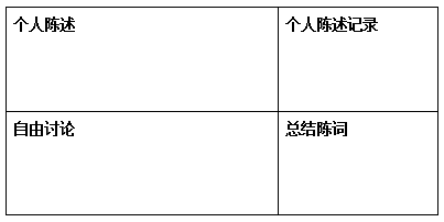 當(dāng)然,考慮到記錄內(nèi)容的多寡,可以調(diào)整四個(gè)片區(qū)的大小,比如個(gè)人陳述提綱和自由討論內(nèi)容較多,可以選擇將左邊上下兩個(gè)區(qū)域面積擴(kuò)大。
