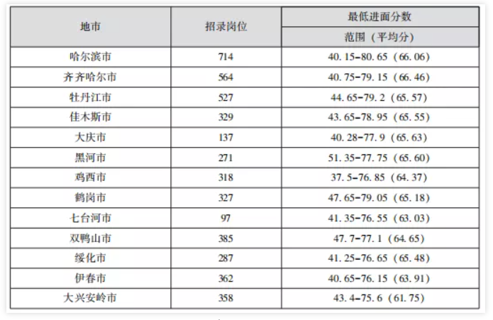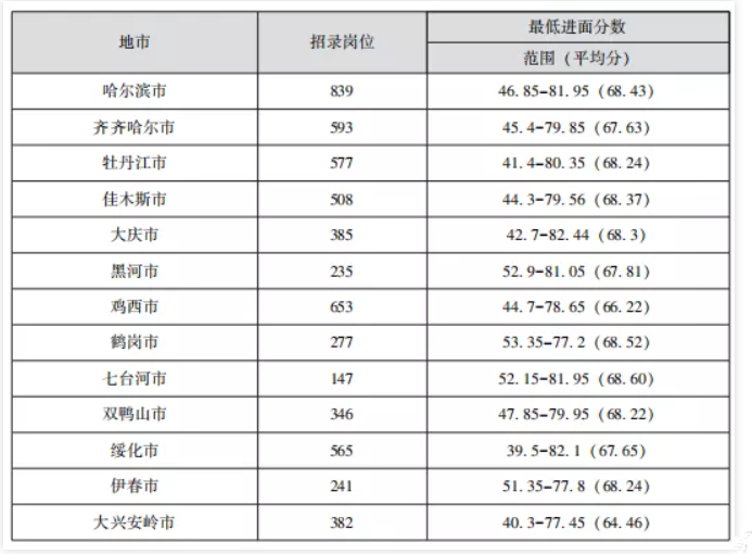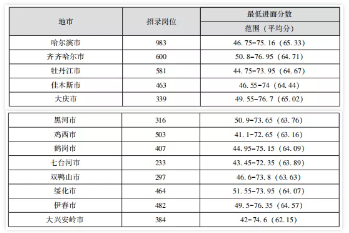 哈爾濱、 齊齊哈爾、 大慶一般進(jìn)面分?jǐn)?shù)較高, 大興安嶺、 七臺(tái)河、 伊春一般進(jìn)面 分?jǐn)?shù)較低, 考生報(bào)考時(shí)可參考近三年進(jìn)面分?jǐn)?shù)整體情況進(jìn)行選擇。