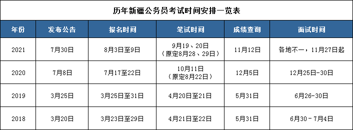 根據(jù)往年新疆公務(wù)員考試時(shí)間安排,預(yù)計(jì)2022年新疆公務(wù)員考試將在2022年7月啟動(dòng),報(bào)名將在公告公布之后隨即展開。以下為最近幾年新疆公務(wù)員考試時(shí)間安排,以供參考。